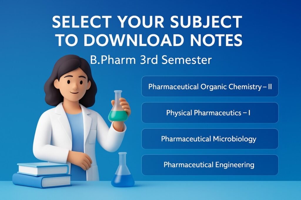 In this post, we’ve provided well-organized and easy-to-understand notes for all core subjects of B.Pharm 3rd semester — Pharmaceutical Organic Chemistry II, Physical Pharmaceutics I, Pharmaceutical Microbiology, and Pharmaceutical Engineering. You can download each unit’s notes in PDF format with just a click. These notes are ideal for last-minute revision, understanding key concepts, and scoring well in your university exams.