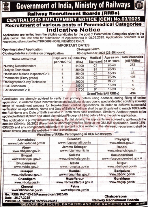 The Railway Recruitment Board (RRB) has announced the RRB Pharmacist Recruitment 2025 under the Paramedical recruitment drive through the Employment News dated 26 July 2025. This recruitment falls under the Centralised Employment Notification (CEN) No. 03/2025, which covers various paramedical categories across all RRBs.